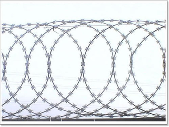 刀片刺繩可以分為幾種形式 刀片刺繩是帶有小刀刃的鋼絲繩索,通常用于防止人或動(dòng)物跨過(guò)某個(gè)邊界。刀片刺繩大概分為螺旋型、直線(xiàn)型、螺旋穿插型三種方式 刀片刺網(wǎng)由熱鍍鋅鋼板或不銹鋼薄板沖壓出尖利的刀片狀,高張力鍍鋅鋼絲或許不銹鋼絲做芯線(xiàn)組合 而成的阻絕器件。由于刺網(wǎng)造形不易接觸,因而能到達(dá)極好的防護(hù)阻隔作用。產(chǎn)物的首要原料有鍍鋅 板和不銹鋼板。